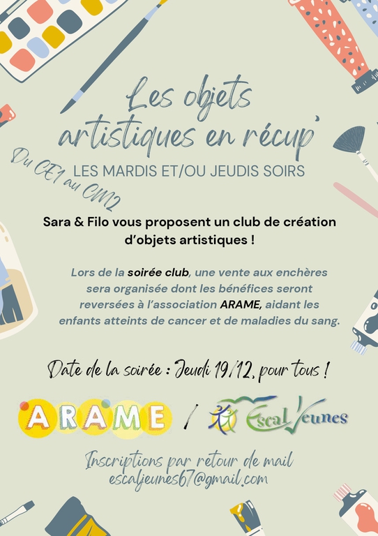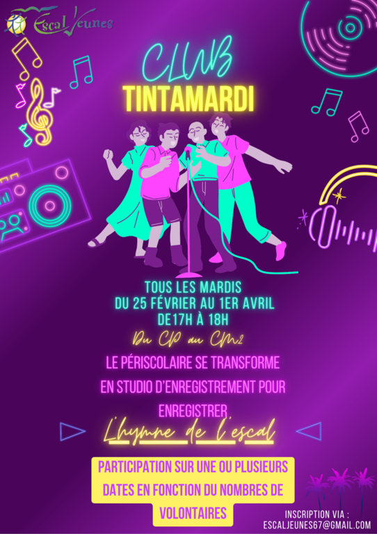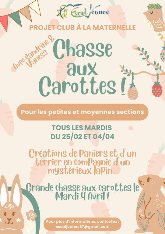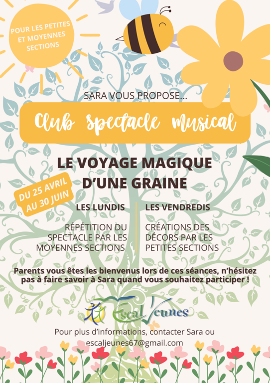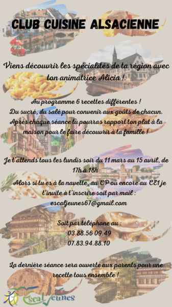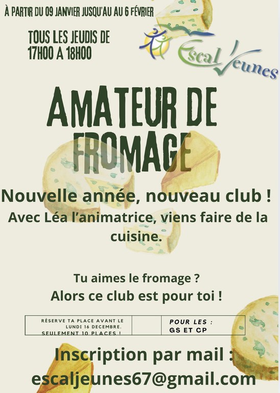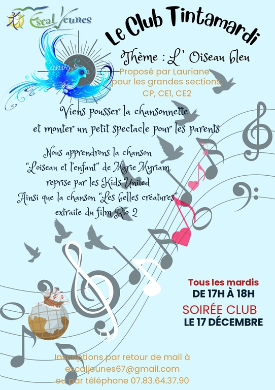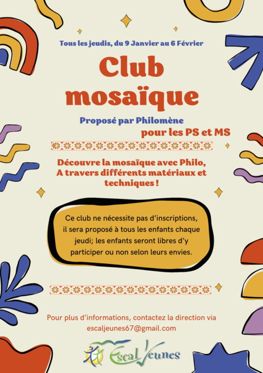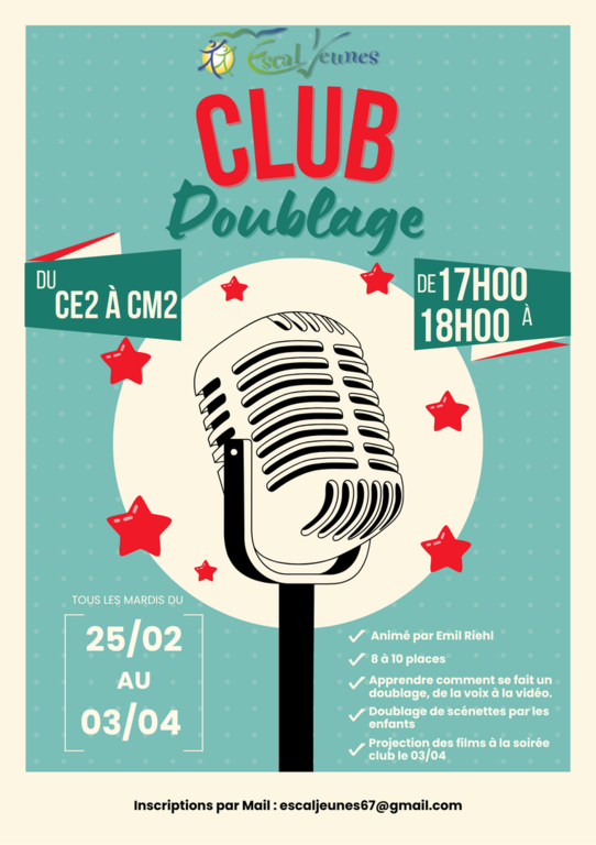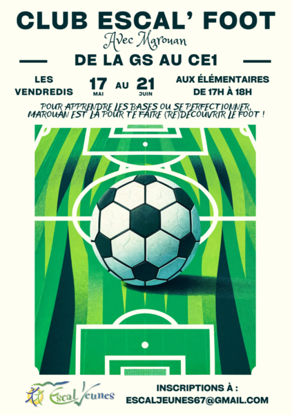 Si vous souhaitez inscrire votre enfant à un club, merci de contacter la direction par mail à l'adresse suivante : escaljeunes67@gmail.com