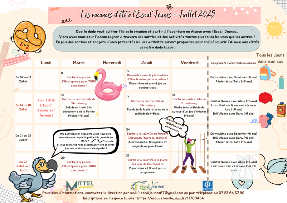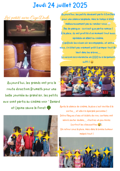 Le programme et les activités seront choisis et organisés avec les enfants de la grande section au CM2. Des sorties et événements qui nécessitent des réservations ou organisations en amont sont également organisés par l'équipe et indiqué dans le programme que vous trouverez ci-dessous.